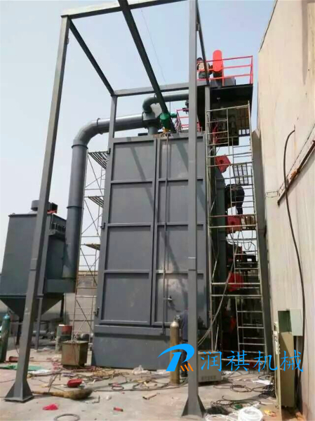 本機工作時,當準備工作(除塵系統(tǒng)、分離器提升機、螺旋輸送器等運行)完畢后,機器開始正常工作。首先,電動葫蘆在室體外裝上工件后吊起,將工件開進清理室,當?shù)竭_拋丸工位時,大門開始關閉,工件開始自轉,此時打開拋丸器,開供丸閘,開始對工件進行拋丸清理,清理一段時間后,關閉供丸閘門,關閉拋丸器,關閉除塵系統(tǒng),打開大門,工件吊出室體卸件。重復上述過程直至工作完畢,按順序停機。